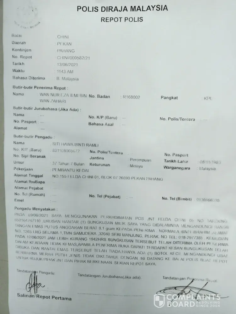 isi bungkusan adalah barang kemas berat 8.1gram utk dihantar kpd penerima normala binti ibrahim alamat no1265, lorong gelama 1, taman samudra sri manjung perak.