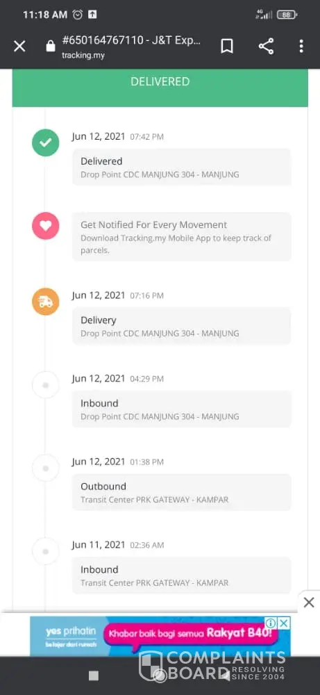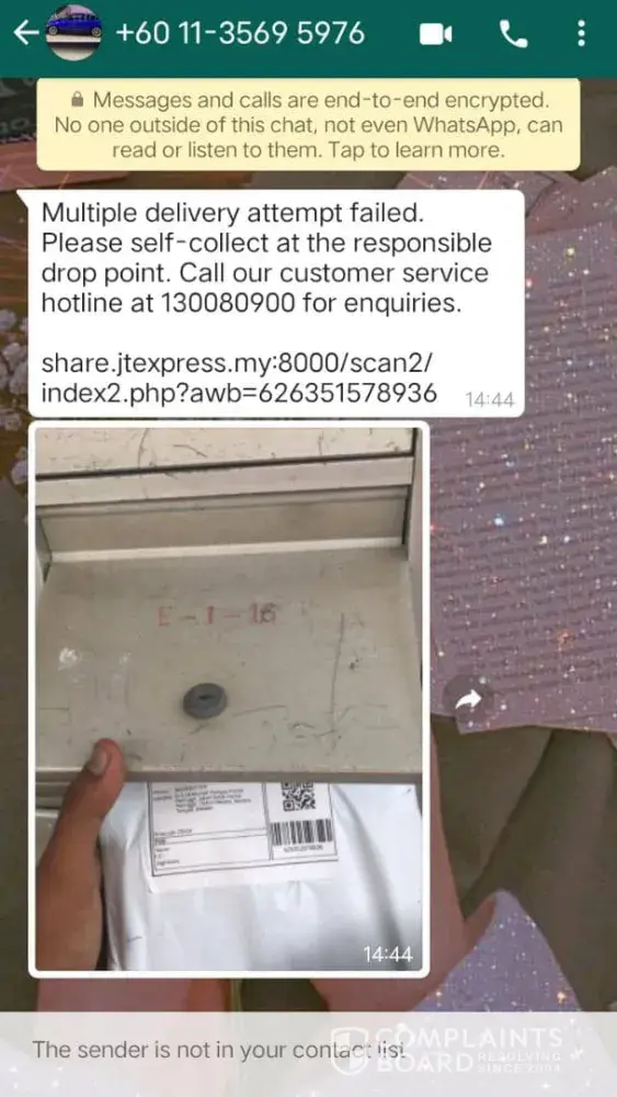 Barang dihantar tanpa dimaklumkan kepada penerima dan tidak dihantar pada rumah alamat yang dinyatakan malah hanya meletakkan didalam peti surat tanya memaklumkan pada penerima. Barang yang dihantar juga rosak teruk. Penghantar j&t memberi alasan telah datang ke rumah dan mengetuk pintu tetapi tiada maklumbalas daripada penerima didalam rumah. Hal ini adalah tidak munasabah dimana terdapat keberadaan pemilik rumah dan penghantar langsung tidak mengetuk pintu rumah. Penghantar juga seperti menyalahkan penerima kerana tidak mendapat barang yang dihantar selepas menerima aduan barang tidak diterima kepada penerima dan berkomunikasi melalui aplikasi whatsapp. Barang lain yang dihantar juga diberi alasan sama malah telah memberi alasan sudah menelefon pemilik barang tersebut. Hal ini juga tidak munasabah kerana tiada panggilan masuk kepada penerima dan penghantar barang hanya memaklumkan kepada penerima dengan menghantar mesej melalui aplikasi whatsapp berserta gambar yang menyatakan telah meninggalkan barang di peti surat kawasan blok rumah berkenaan
