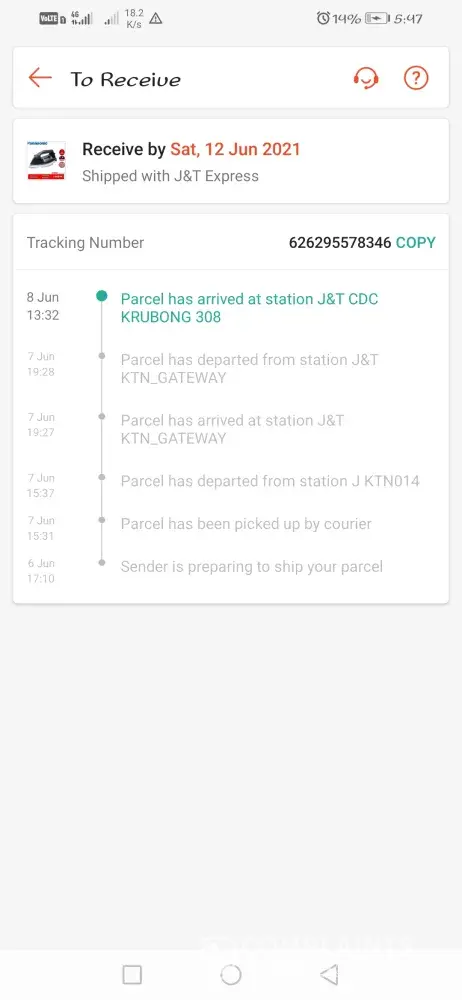 penghantaran 9.06.2021, pukul 1.48 petang dari J&T Chini 5