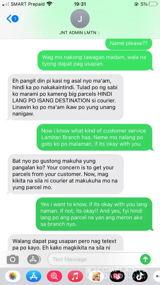 (Omar Cabbeh), the courier reported that my receiver was unavailable that time date May 8, 2021. On behalf of my receiver it is not true because my receiver wasn't leave the house that day because she was expecting her delivery that day. My receiver once told me that its happened for many times if the rider is neglected they really don't deliver it to the receiver. I texted the courier that night May 8, 2021 at 9:11PM asking him why he didn't deliver the parcel of my receiver because badly need the parcel because my receiver will going to use what she bought to me on Eid'l Fitr day. But suddenly this issue came up, the rider replied to me that night. Please see printscreen below! I feel humiliated on my part because I've encountered a more than of hundreds of JNT rider but this one is different, they don't know how to handle customer complain. Yes! Really, they are! Later that night around 9:36PM the admin of the Lamitan-Branch called to me saying that my concern was raised to her by the courier. The admin of the branch explained to me everything and I also seek a help from her because i'm counting on her. If she can tell the rider to please deliver the parcel of my receiver tomorrow morning May 9, 2020 she said that there is no problem with that. She also said that she will priority my request, and I also told here that I have more than 10parcels to arrived that day May 9, 2020 I even send to her all my waybill no. to please monitor all of my parcel and to please do not RTS any of my parcel coming from me, because the rider of this branch once they feel neglected they really don't deliver the packages to the receiver and thats the problem with that Branch. Around 3pm in the afternoon May 9, 2021 my receiver texted me that the delivery rider wasn't there pa po and its already 3pm in the afternoon. The admin of the Branch once told me that their cut-off is every 4pm in the afternoon. I told right away my receiver to just go to the branch for her to be able to get her parcel because its already 3pm in the afternoon they might RTS it once the delivery is unsuccessful. I texted the admin of the branch right away about the situation, the admin called to me and talked to me in a sarcastic way she even shouted at me and she hung-up the phone right away. What a shame! The admin of this branch has a short temper.