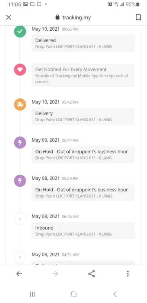Merujuk kepada consignment no : [protected]. Pada 7/5/21, saya pergi ke J&T Express untuk membuat penghantaran barang dari Pekan, Pahang ke Klang, Selangor. Keesokan hari saya menyemak status penghantaran, menunjukkan bahawa parcel saya sudah tiba di Port Klang (8th May 2021). Tetapi, pada 8/5/21 tidak sampai hantar ke tempat yang dituju. Sebaliknya, melalui J&T tracking no menunjukkan "On Hold - Out of droppoint' business hour" pada 8/5/201 & 9/5/2021. Barang ini dipegang di Port Klang selama dua hari.
