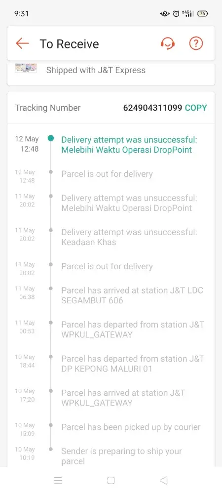 Pada 10/5/2021, I cuba membuat panggilan ke pelanggan perkhidmatan, I berjaya bercakap dengan agent perkhidmatan. Saya melaporkan masalah yang dihadapi, agent memberitahu akan cuba menghantar barang pada 10/5/21. Pada hari yang sama, barang dah sampai.