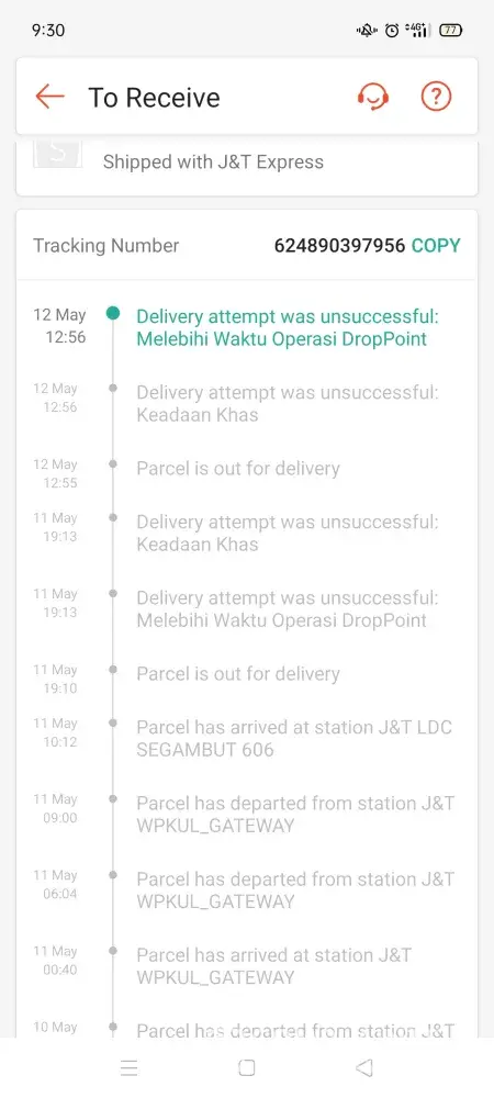 My parcels stuck at the store and the system notified 2 times that 'Delivery attempt was unsuccessful: Melebihi Waktu Operasi drop point: Keadaan Khas. I've been at home all this week and no one from J&T ever came to deliver it. What is the meaning with Keadaan Khas? Tracking number is: [protected] and [protected]. On website also don't have any contact number of the store. Please send my item asap. Thank you.