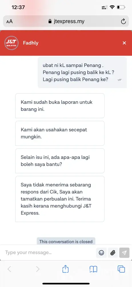 9/4/21 when I send my parcel to j&t outlet already inform urgent case because this is baby medicine. But the font desk staff no mention about I can just add on rm3 to take express service. On 10/4 I call 4 times call center to help delivery. The parcel already reach my nearest brand. At the end told me that brand already close. I can't get tonight. Even already reach nearest brand. At night system show the parcel send back to bukit bintang. Any one can tell me why? My baby suffer because of j&t take my parcel to send back to kl. If not I can collect on morning. I text live chat. J&t live chat argent not willing to text more to me. Even I still chat with him I not yet reply he direct close my conversation. I am j&t supporter. Daily using j&t even for my personal or my company. After I facing this issue I will reconsider it is I still can support j&t