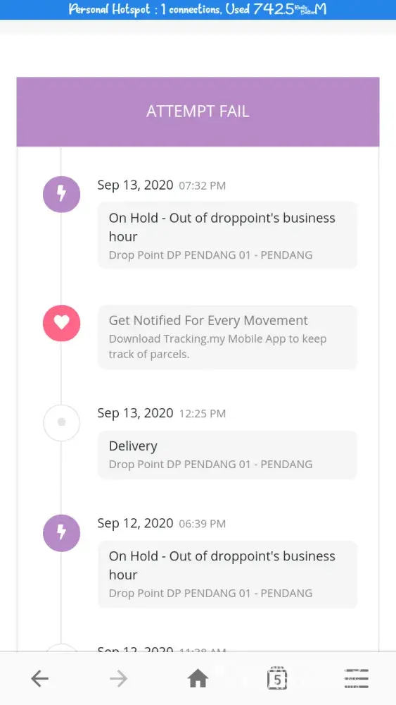 My parcel still on hold for twice bcoz out of business hour. When i call staff, they said they already nearby my area. And suppose to be got enough time to deliver. My parcel only from Penang. And my house in Kedah. Its takes forever to get your parcel. Maybe if my shippment from oveseas. Never get it i guess