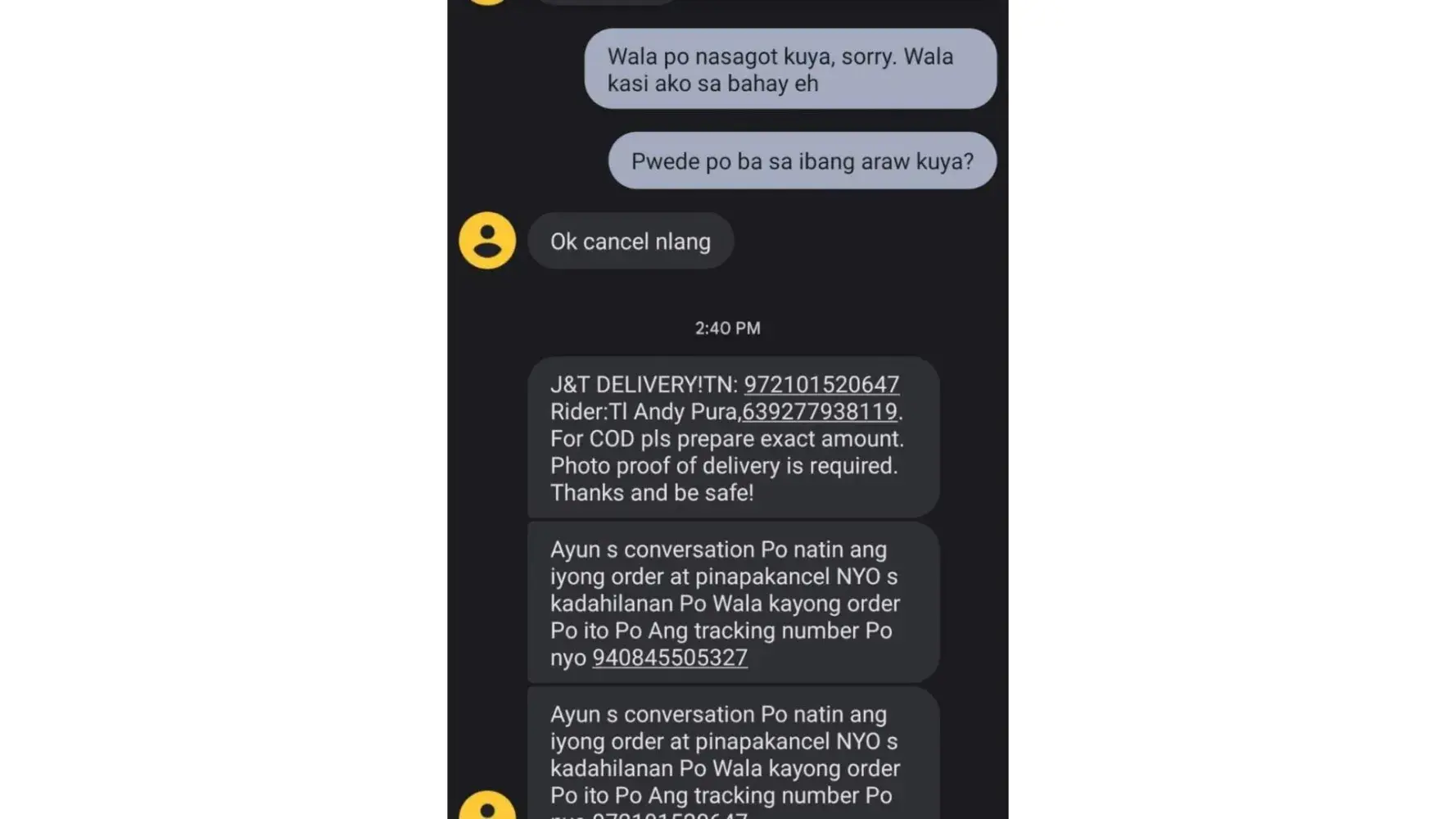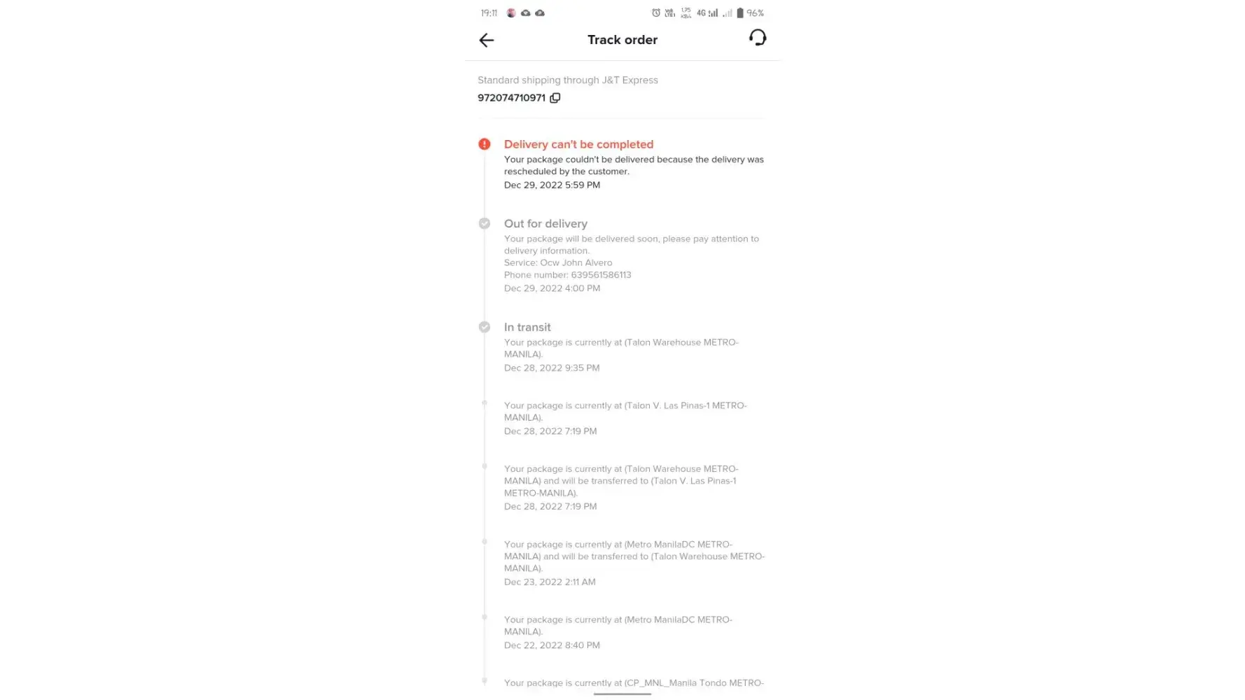 Yong item ko 2 beses ng hindi diniliver yong rider di sumasagot yong pangalawang rider sabi nya Wala na daw sya sa jnt at ginagamit lang yong name nya Hanggang inabot na ng dec 29 wala akong narecieve di ko naman sa minamadali pero sa bigyan ng maayos na response kahit warehouse hindi sumasagot pinapatayan kalang