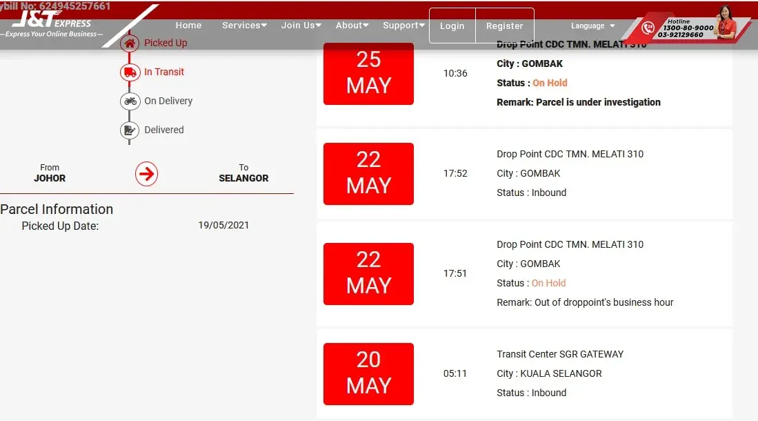 sama kes mcm saya boss, on hold jugak,tapi alasan dia letak office hour.apa benda la jnt ni. boleh je call kalau betul dah buat delivery tp xde orang. tapi hakikatnya mmg dia xhantar pun lagi.