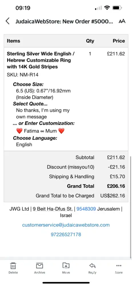 Subsequent investigations on my part have proved that the funds were transferred on the 7th April 2022 and your bank in Israel have confirmed receipt of the funds twice in a row to my bank. However Akvia still claims that you have not received the funds. This has been going on now for a month and I do not have the rings or my money back. I have sent proof that the transfer was made to your bank using the following swift code: NWBKGB2L and the following international tracking reference number: 7A6EDD78-B56F-41EC-BFA2-22ADC0033CB8.