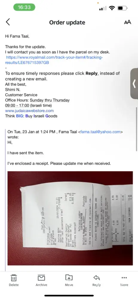 I would like to apology’s to JudaicaWebStore for my bad review. My order was in fact placed at a timely manner and was no fault of the store for the delay. And I am thankful for their quick responce to my frustration. Thier service is excellent. They got right on it. It turns out I was not aware that Customs can and will hold your order for as long as they want! Is no fault of JudaicaWebStore. I did receive my Star Of David necklace And found it to be even more beautiful then the picture! I absolutely love it! The Quality Deserves A five star rating and that is why I felt need to clear up my first comment and replace it with a well dirserved complement in all aspects .