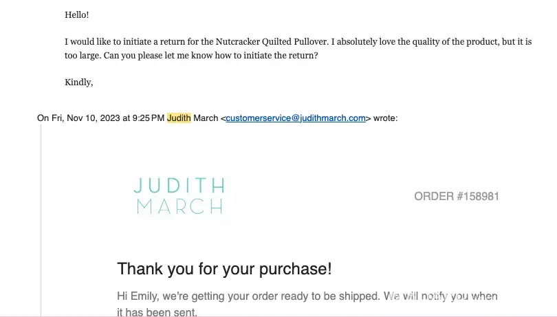 I ordered a sweatshirt from Judith March on 10/29 and as of 12/6 today it still has not shipped