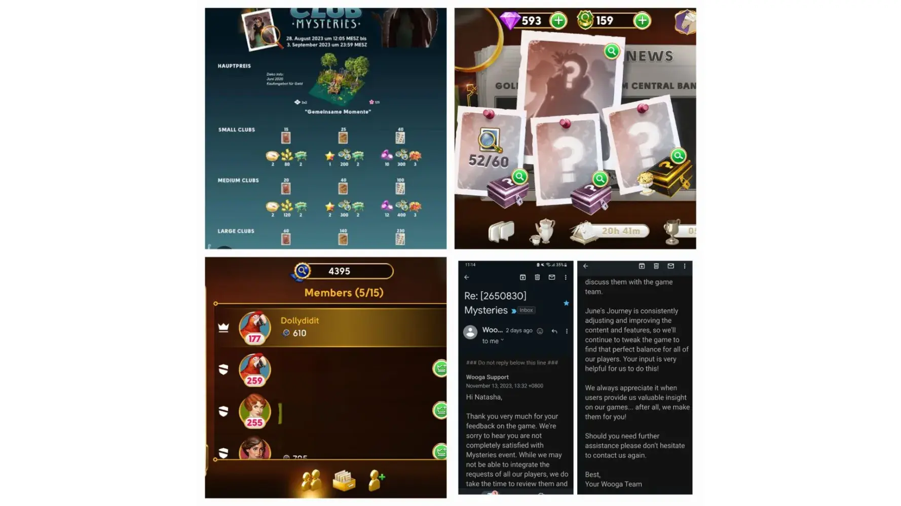 The developers sent a response within a short time, which I appreciated. Initially I rated this 3 stars, but after the past couple of weeks, I demoted it to 2 stars and thought about 1 star. The reason is mainly about additional items like snippets, which are cutouts from memoir pictures. Each picture needs 9 snippets to complete. While you can complete a few pictures, for most of them you need rarer 4-star and 5-star snippets. However, after the first few packs they start repeating. I won a 4-star pack, and ALL of the snippets were Deja VU repeats. That is so wrong! What sort of prize is that? Just as a reference, out of 80-90 snippets in the past couple of weeks, 71 were repeats! I understand there is a need for a profit, but Wooga is getting way too greedy.