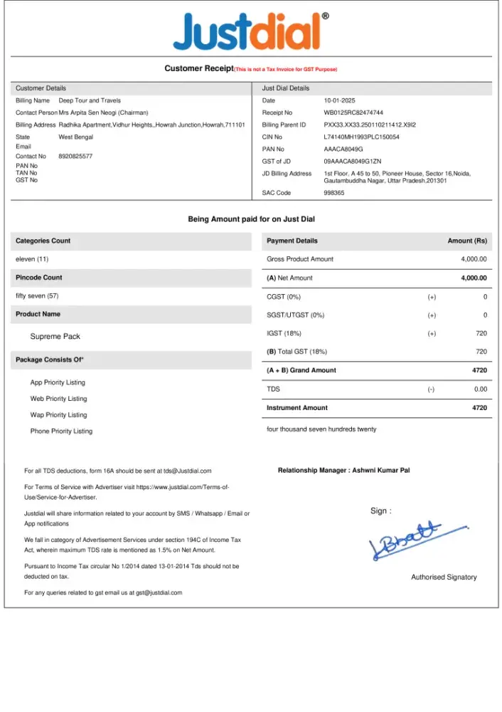 Mr. Ashwini Paul, of their Noida Branch visited our residence along with one of his colleague and briefed about the Supreme pack. They said that initially to start with they will require an amount of Rs 4000+GST. We made the payment of the same (Receipt enclosed) and told them that the service to be implemented from Kolkata region.