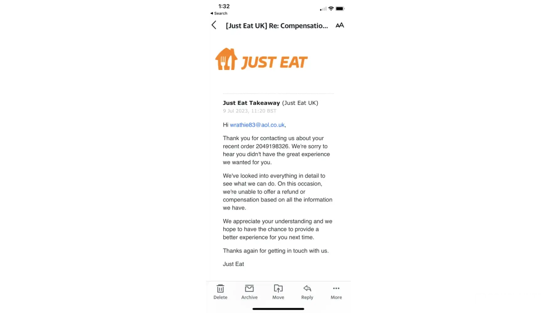 Desired outcome: Full refund an apology and a McDonald’s on just eat as compensation