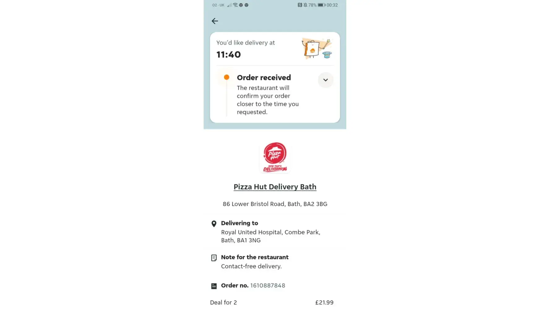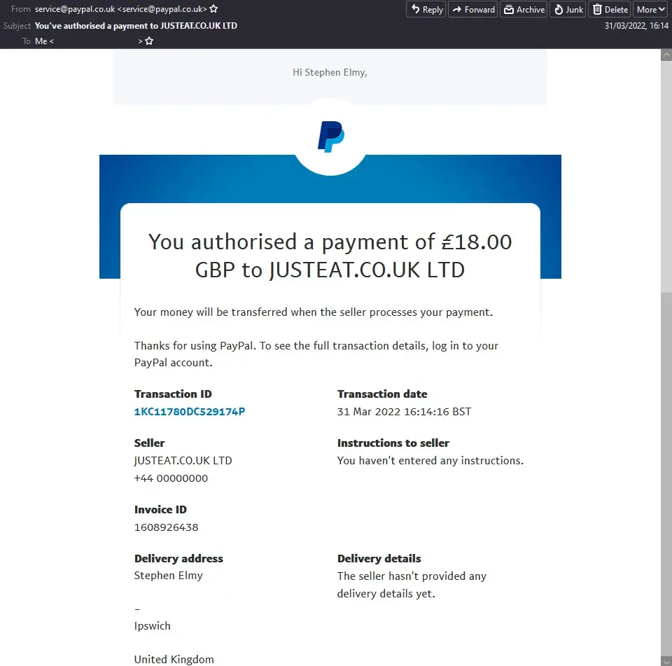 On Thursday March 31st I Made my weekly Takeaway Order, this time with Burger King in Ipswich. The order was paid for and confirmed by both Just Eat, PayPal and the branch of Burger King at 16:14pm, with requested a delivery time of about 18:15pm. I arrived home early from work, and both myself and my wife waited in our Lounge (we live in a terrace house and this room is right at the front of the house for our food to arrive. The only sound we heard outside pertaining to a takeaway delivery was next door at a little while after 18:00. When my wife became concerned as to where our food was, I looked at the order screen, and it showed "18:20", "waiting for update" (with a spinning hourglass), and "driver assigned". At about 18:30pm I decided to try and telephone the branch of Burger King, but was unable to get anybody to pick up at the other end on three separate occasions (between approximately 18:30pm and 19:10pm), it simply rang and rang until the line beeped. At 19:30pm, the order screen finally changed status, to "DELIVERED", still with the time "18:20". I was understandably furious about this, and left a triple 1-Star review as a result. I have attached to this complaint a screenshot of the confirmation email I received from Just Eat (with order number), one of the order screen on the Just Eat Website with it's review, and one of the PayPal confirmation email, complete with date and time (31/03/2022, 16:14).