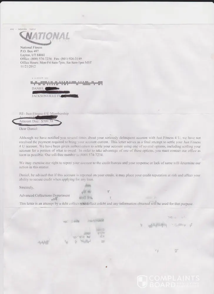 So now here we are, and I have finally demanded that he call and deal with this. He has said that many, many people here in FL have told him that Just Fitness does this to everyone. The letter threatens to report the debt to the credit bureau as well. A $700 charge on anyone's credit report would be damaging. I'm sure calling them will do a whole lot of NOTHING, but I will update. We'll be awaiting their apology...