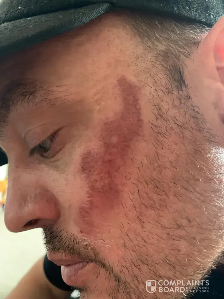 Hi I bought your product from my local store did a patch test on my arm was fine ,so I used the product on my beard as instructed,then it was itching then I had blister's and now it all feels burnt awful discomfort had to shave it off ,I'm still in discomfort and using burn cream on my face made me feel so I'll,I'm not happy at all ,and if it doesn't get better I'm gunna have to see a doctor for medical advice