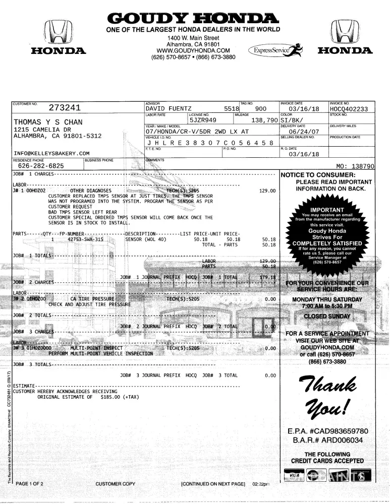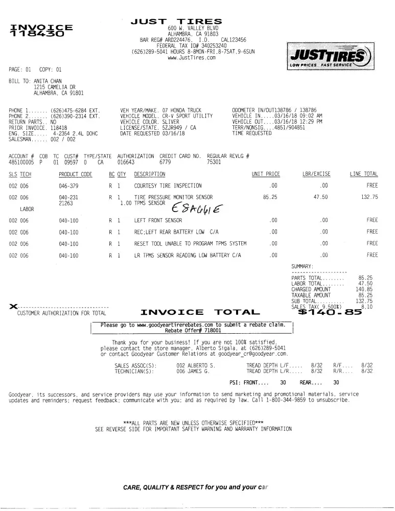 I would ask the refund of $129 from Just Tire on the diagnoses done in Honda dealer. Both invoices are attached for reference. I spent total of $1019 in these 3 days with other services.