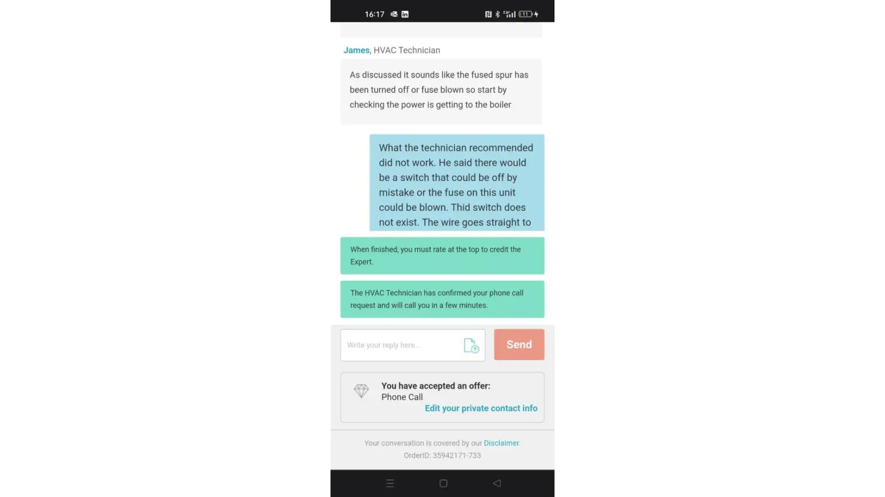 Customer: No, there is no electricity coming to the boiler