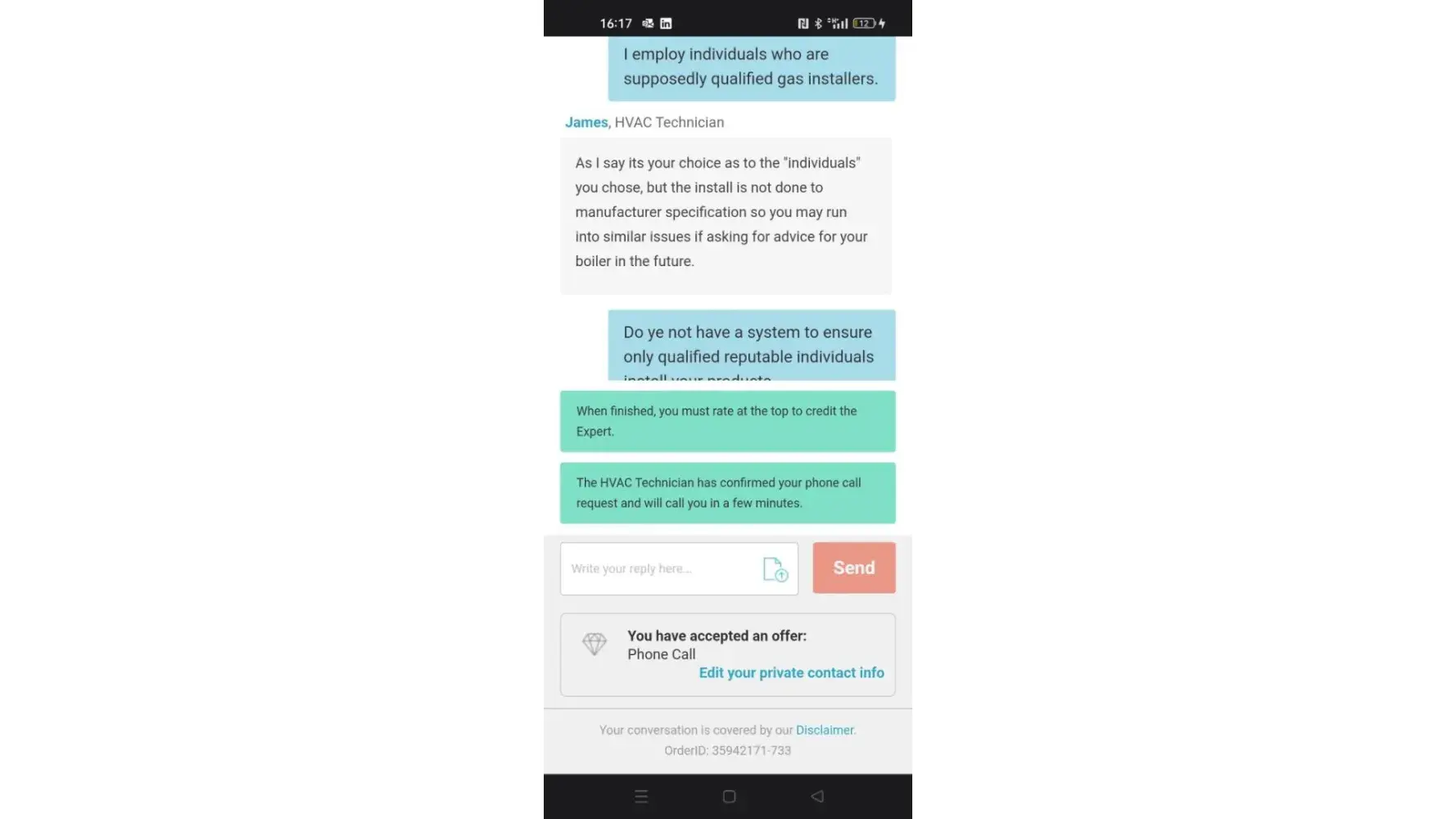 As I say its your choice as to the "individuals" you chose, but the install is not done to manufacturer specification so you may run into similar issues if asking for advice for your boiler in the future.
