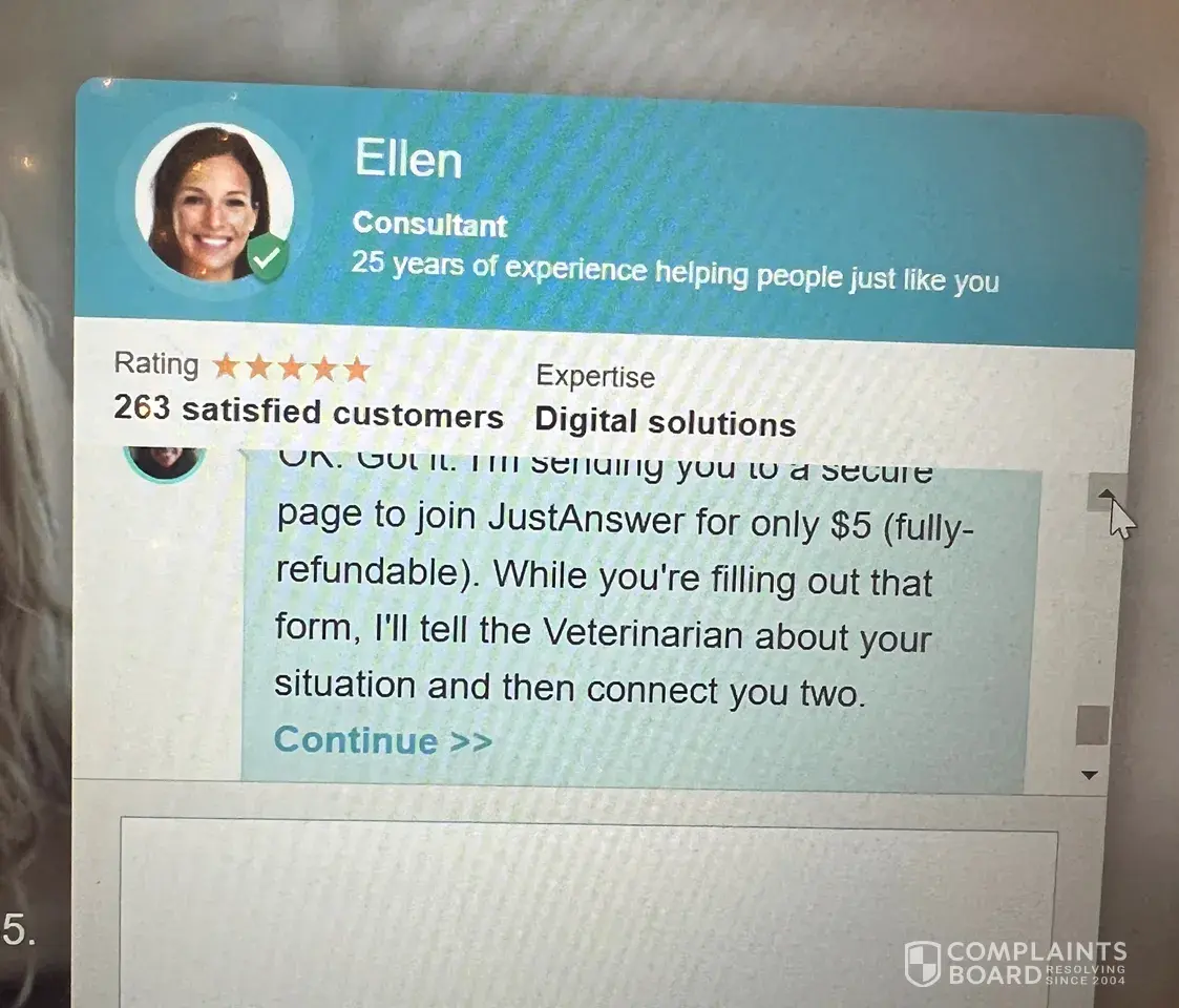 I was experiencing an emergency with my pet. I did a Google search to see if something my dog ingested was poisonous. I was directed to Just Answer. After a brief description of my issue I was redirected to a form to pay a fully refundable $5 fee to be connected to a vet. I now understand that their tiny print with full terms of service says they are going to charge you a monthly membership fee but people that end up on this site are likely in a urgent state of mind to get an answer. Who thinks to click on another link and make sure they aren't getting scammed. Just Answer takes advantage of vulnerable people and springs surprising charges on you. They didn't help me anyway. A company that operates business like this should be ashamed of themselves. It is immoral and lacks integrity. They do not have a satisfaction guarantee as they state. I will never recommend this company to anyone. In fact, I'll tell everyone to run as fast as they can in the opposite direction. I'm disputing the charge with my bank and including the screenshot that said $5 fully-refundable. COMPLETELY MISLEADING.
