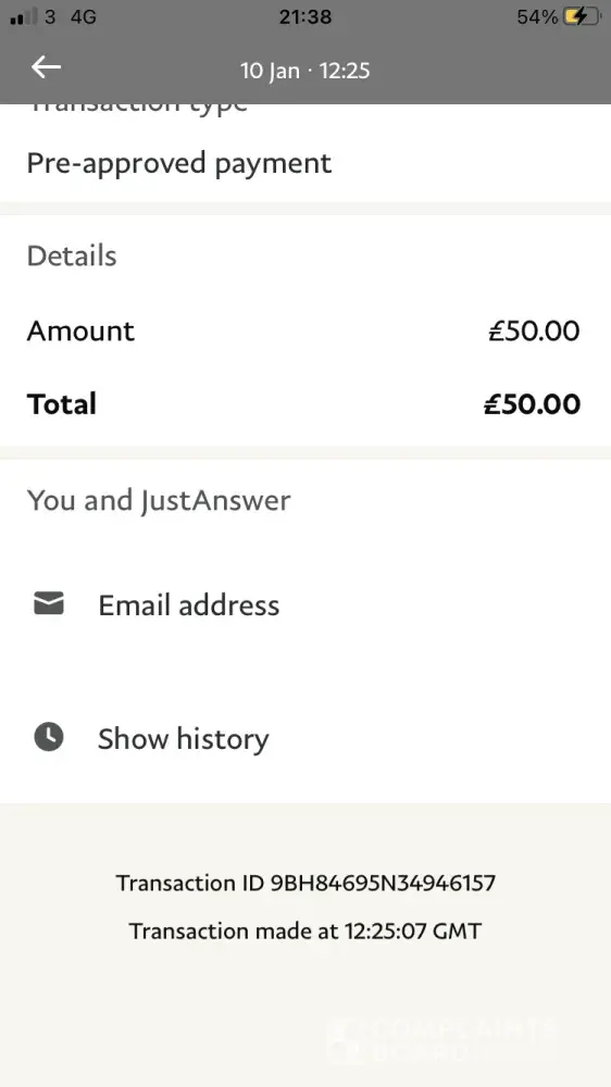 ‘Just answer' charged £50 from my debit card via PayPal for their subscription which I didn't sign up.I didn't create any account with them .I wanted get some legal advice .when I searched online I found this site.you can get answer for one question just for £5 one off payment .I paid this money though my PayPal account and I got an short answer which I already knew.it didn't help me at all .after all received the answer via email and the text.I didn't receive any email from they about their subscription or anything at all.