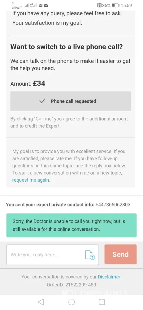After that been chatting with doctor somehow been offered a phone call instead of chatting, wich I accept. I didn't know I have to pay. After a wile checked my bank been charged 34 paunds fee. Quick I write back to doctor to not call me couse I didn't know I have to pay. However I tried to contact with customer service to explain the situation but suddenly no answer.
