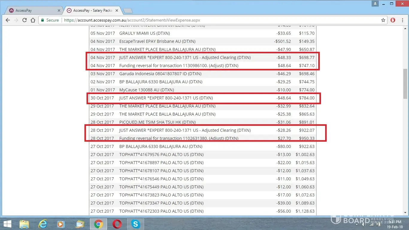 On the 24th October 2017 I asked a question of Just Answer Expert no. [protected]. The question concerning a mechanical issue with our Jeep CJ7 was answered satisfactorily and a charge of $6.60 was made to our credit card. The same day another charge of $27.70 was made. On 25 October a reversal was recorded of $6.60, then another withdrawal of $6.61 was made. since then numerous other charges and reversals have occurred.