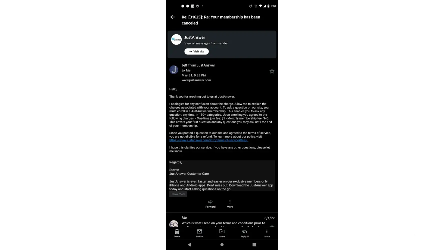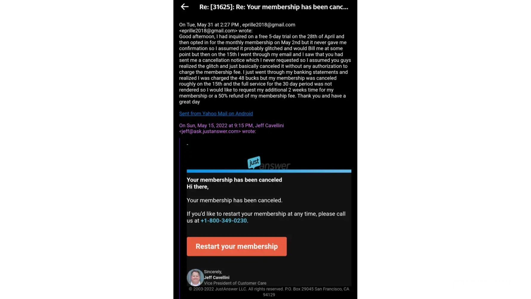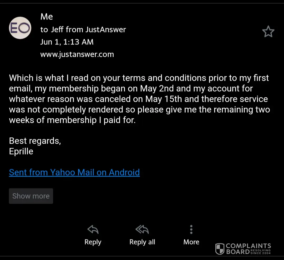 You're right, nothing is really free in this world except kindness honesty a few other virtues. But at the end of the day customers deserve to know that they are actually going to be charged and that they have to take an action in order for their cards to discontinue those charges monthly. It is a clickbait setup that advertises that we only pay a dollar for one question and then after 5 days they charge your card $46 every month and many people are not aware of this because it's in the very tiny fine print of the terms and conditions when you do the $1 charge. It's extremely misleading and although I do agree that customers should not be able to contact you years later and get a refund that's absolutely absurd but customers a majority of the time are being sucked into a $1 fee only to find out they're being charged 46 times more. Not only that but when people request a refund they don't always get that refund and they have to fight their Banks and they have to file reports because I've seen thousands of cases where that is exactly what happened. You have a fair argument on your side when it comes to customers canceling getting refunds and Etc but a majority of these complaints are by people who are not aware that they were going to be charged monthly outstanding fees. There's a program that monitors people's usage like when they ask a question how many questions and of course it keeps record and documentation, what's beyond me is that they don't use the same program to confirm that someone only asked one question or that they didn't use the service for 6 months in a row and we're not aware that they were being charged in the first place. The guys above you are stuffing their faces with all of this dirty money they get to keep on default because they know the merchant account and financial system much better than most people and that in itself is an abusive power and privilege.