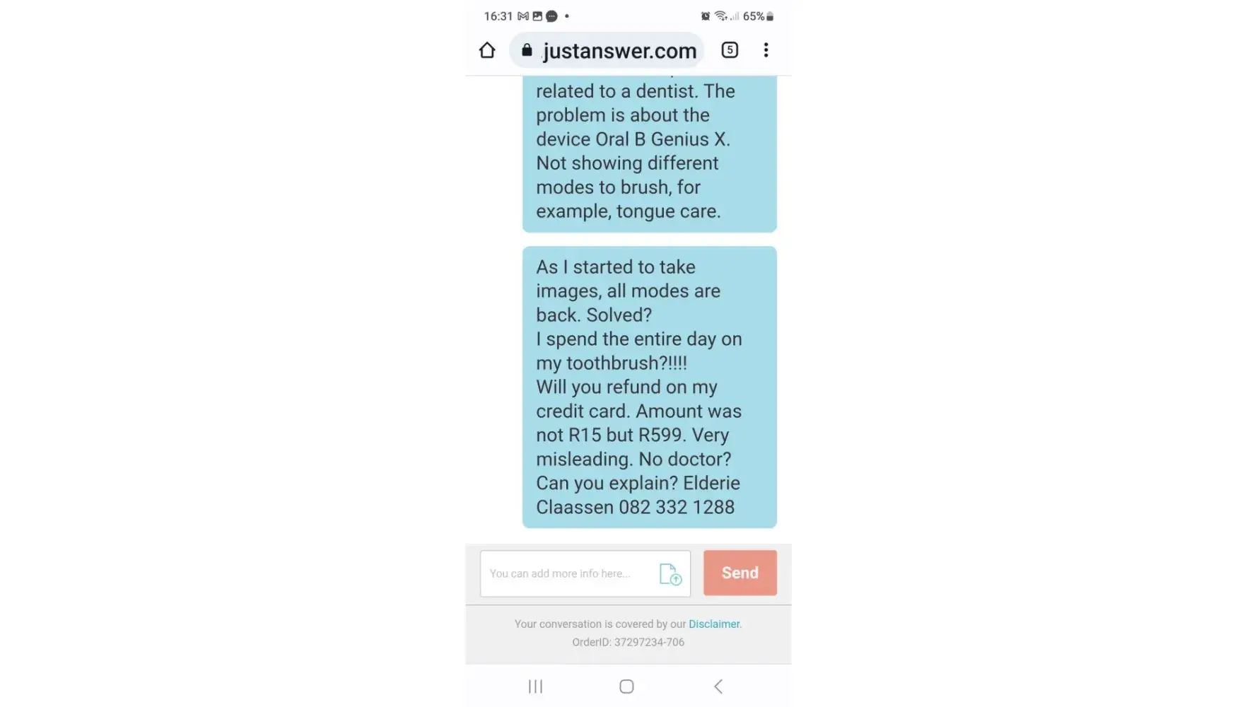 I did not register on the JustAnswer website, so I do not have a password. To proceed, I had to make a payment. JustAnswer has my banking details saved, and I am unable to delete them. Will they refund my credit card? The amount was supposed to be R15, but R599 was deducted from my card. It is highly misleading. No doctor provided assistance, and there was no help with the toothbrush settings.