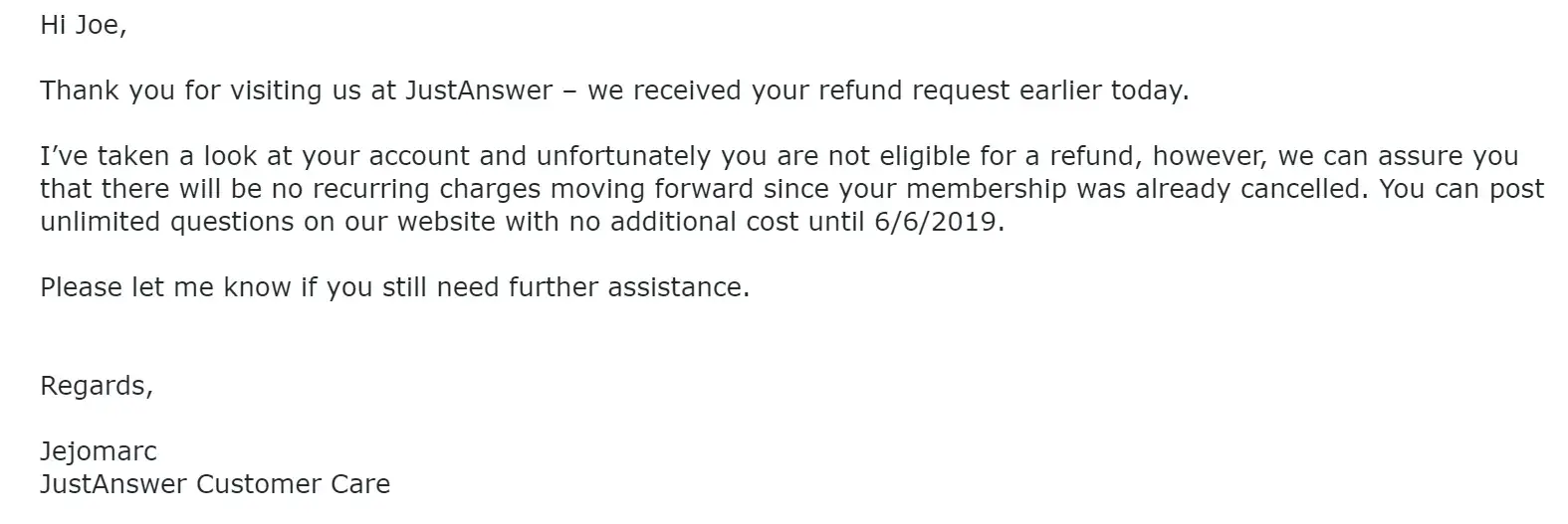 We had received no refund of the $46.00 charge. Over a month later, on 7/22/19 at 1:00 am, we received another email from Just Answer saying, "Your membership has been cancelled as of today. You will no longer be billed on a monthly basis." Again, there has been no refund of the $46.00 membership charge. This appears to be a scam that draws you in to a unwanted monthly membership after asking help for a simple one-time problem.