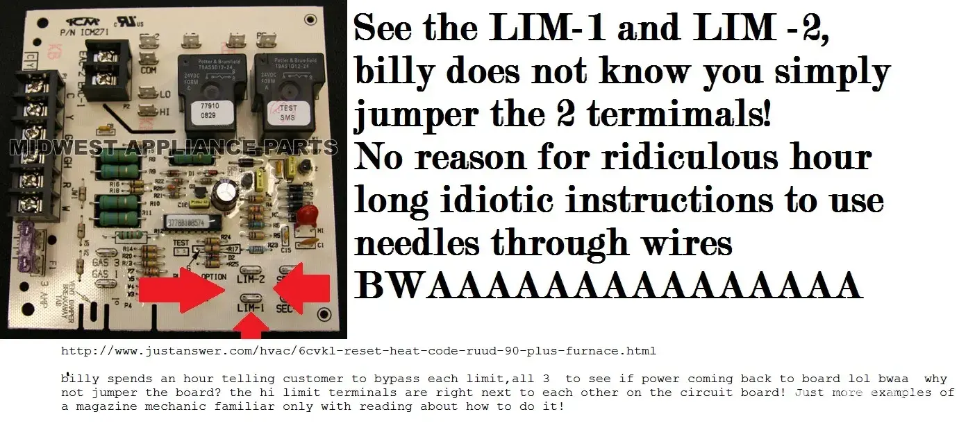 billy1961 spends an agonizing hour telling customer to bypass each limit, all 3 to see if 24 volts is coming back to the circuit board! lol bwaaaaaa!