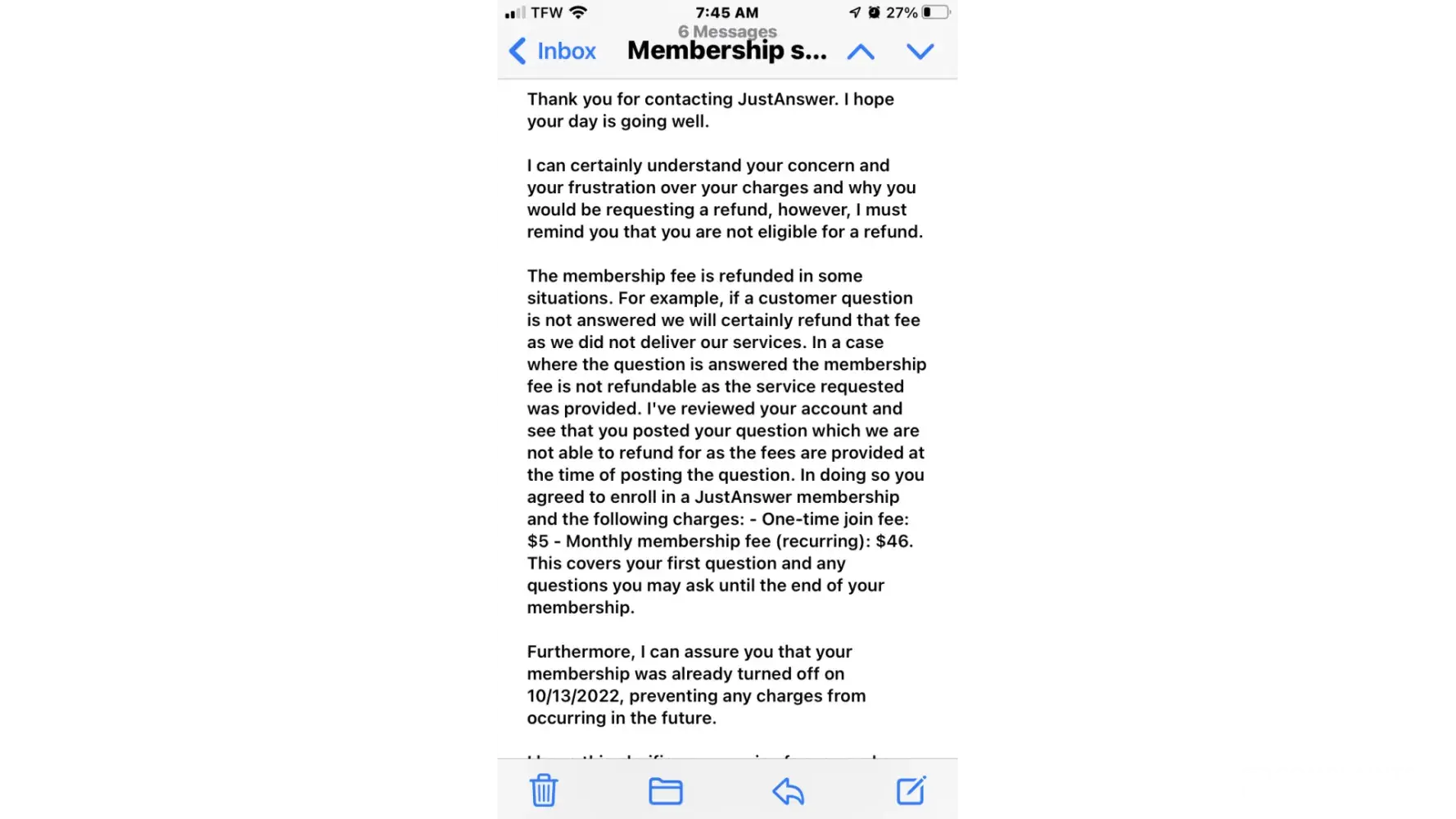 I signed up for the 7-day, $5.00 trial, then searched the "Just Ask" website for instructions on how to cancel the service. I found nothing, but was automatically charged $46.00 on the 8th day after trying the service. The answer I got for my (supposedly) $5.00 fee was useless. DO NOT SIGN UP! This "service" is just a scam.