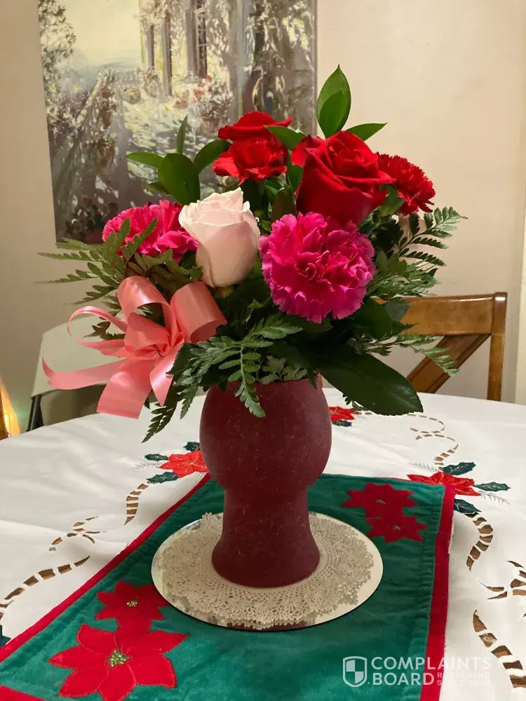 i made an order on or around 20, 12, 2021 order number 9509812. The order was for the flowers in picture 4. i also paid an additional $10 for more flowers to be added. In pictuers 1, 2, and 3 is the flowers they sent which is far less than shown on the advert i chose. I have spoken to someone from Just flowers and they insisted that all they could do was refund me $15. I asked that they just replaced the flowers and send a bunch of flowers as shown on there advert, but they insisted that all they would do is refund me $15
