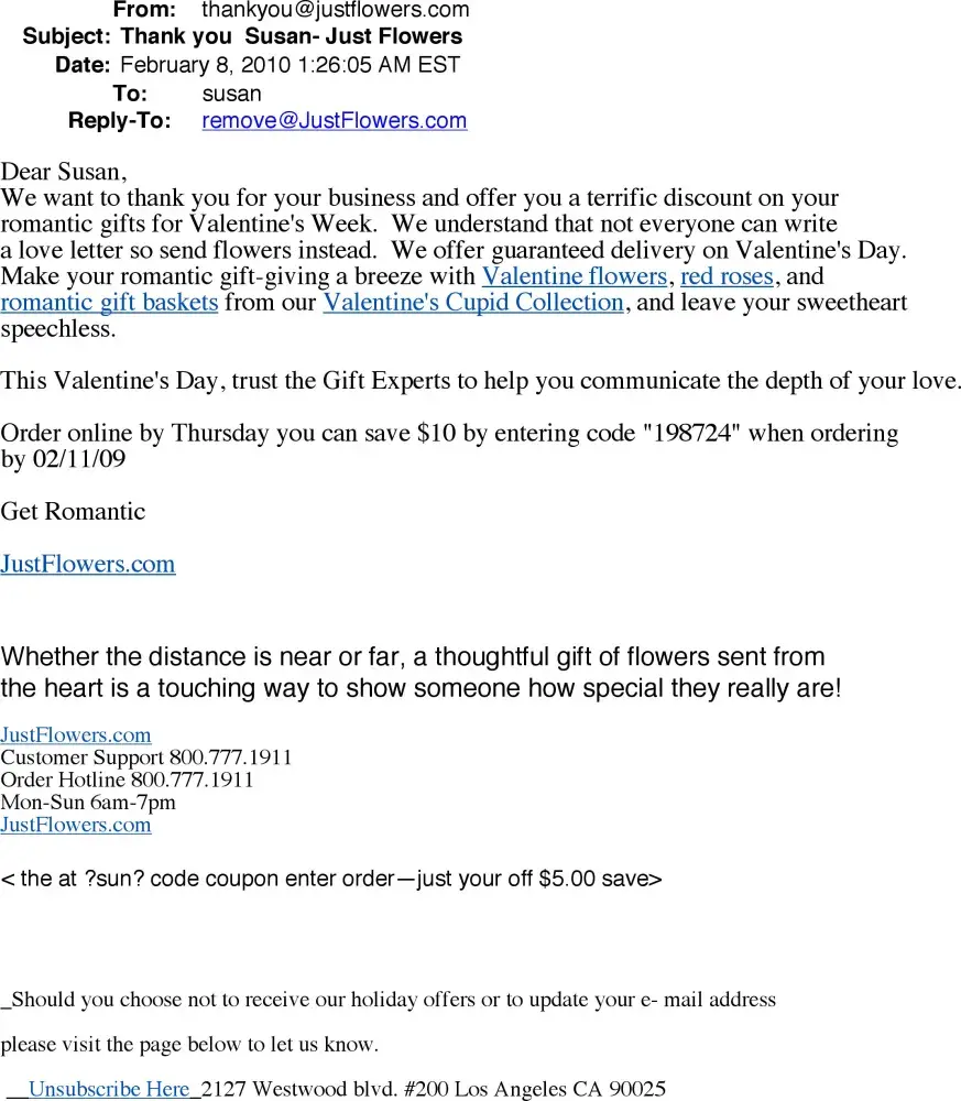 My flowers were delivered, I was satisfied, but then I started to receive unsolicited emails. I have tried to unsubscribe as shown a numbers of times, which works for about a month, and then the pleading hands appear from JustFlowers again and I am bombarded with emails.
