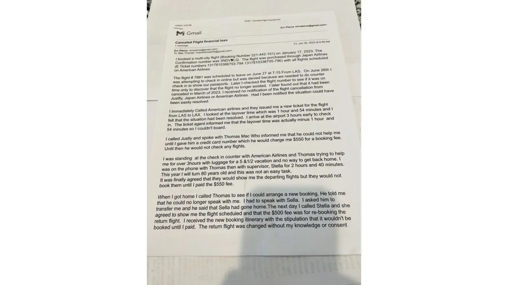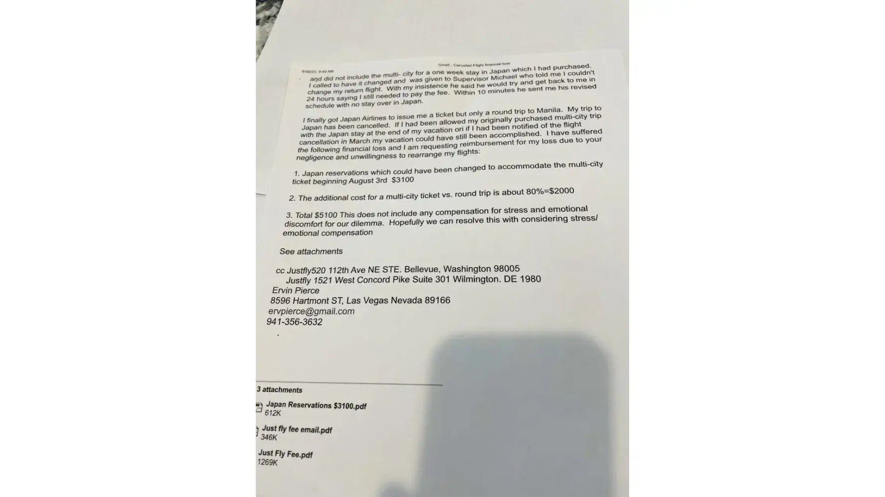 I booked a multi-city ticket from Las Vegas to Manilla with a 6-day layover in Tokyo on January 17 leaving Las Vegas on June 27. On June 25th when I checked on the flight status of the first flight from Las Vegas to LAX I discovered that the flight had been canceled in March and I was not notified. Thomas Mac of Justfly refused to help me until I paid an additional fee of $550. American Airlines tried to resolve my dilemma by issuing me a new ticket but when I arrived at the airport I was informed that the new ticket would not make my connecting flight from LAX to Tokyo so I was denied boarding. Later Japan Airlines offed me a ticket to Manila but refused to honor the multi-city layover in Tokyo which cost me an additional $2,000. I also lost $3000 in accommodation and guide expenses in Japan. Booking number [protected] Ticket numbers [protected] & [protected]. Confirmation # 3NDVLQ. I wrote to the two USA offices that were listed on the internet but both letters were returned as undeliverable.
