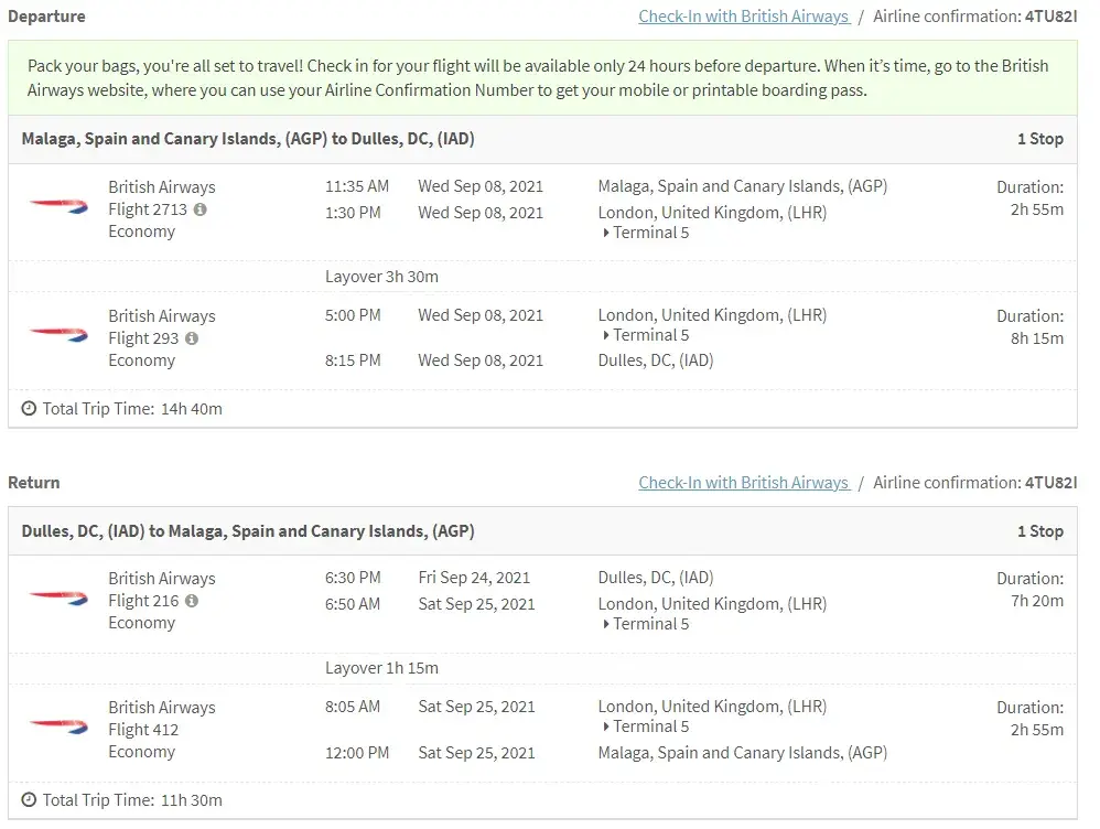 I booked 2 "Economy Class" flight from Malaga, Spain to Washington Dulles on British Airways for myself and my wife. All information on JustFly website indicated that the tickets were "Economy Class" which meant each traveler was entitled to take one piece of hand luggage and one piece of suitcase during both legs of the journey.