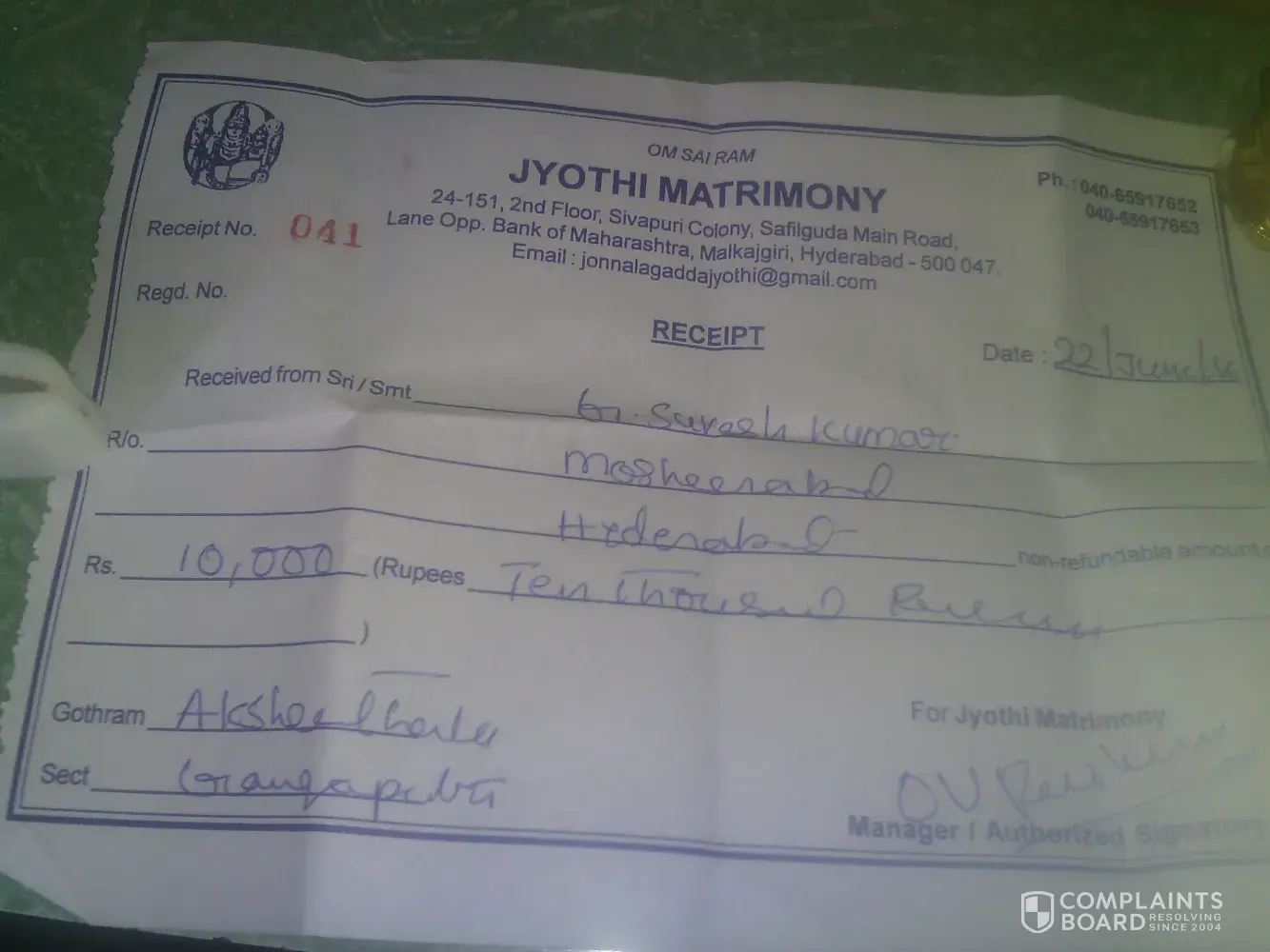 I had registered this bureau for Instant Marriage Membership for my Me which is valid for 60 days and paid Rs.10, 000/- as a Membership Fee by way of Cash. Till today no communications from their end and every time send an SMS for refund of My money that too after too many follow ups. But no response. And i did not receive any support upto 03-09-2016. What is the Meaning of Instant Marriage till the time of Death for Searching Brides? i spoke to the Concerned Person regarding Refund of Money simply he says no refund as per our policy. The member ship charge is Rs 10, 000/- I have asked for refund of my money as they did not provide the support( as per their claim). They are not ready to refund the money and they are showing the Audacity. I want to sue Jyothi Matrimony for their wrong claim to me for the support and showing Audacity and not paying my money back. I request your team to help us highlighting this complaint. We request you please kindly do the justice to the public.
