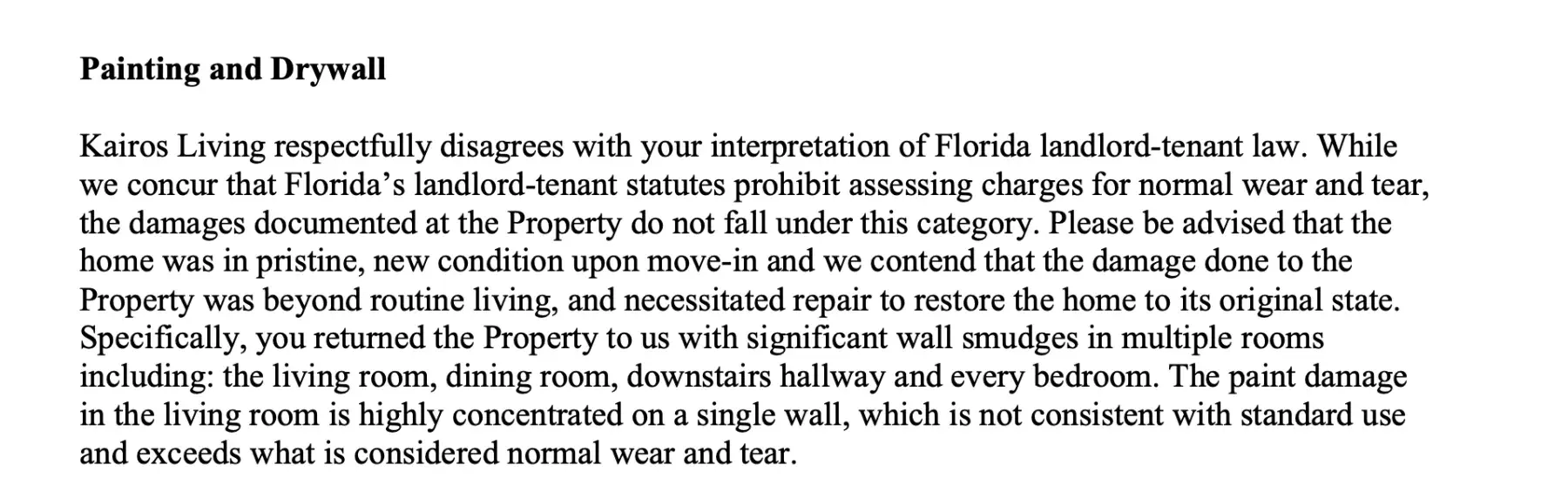 We rented this home from July 2024 (with DR Horton) until we moved out on March 20, 2026 (almost 20 months). Kairos never performed any baseline or move-in inspection when they acquired the property in March 2025. Instead, they are treating a previously occupied, used home as if it was delivered in “pristine, brand-new condition.†Their so-called...