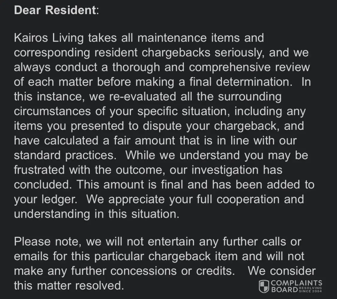 Sadly I've had no issues with Kairos until I moved out. They refuse to read over emails and take in all the information regarding my dispute. carpets and paint being my two biggest charges and minor stuff that at this rate I don't mind paying do to fear of going to collections Carpet was uprooted and had clear urine stains before I moved in and provided...