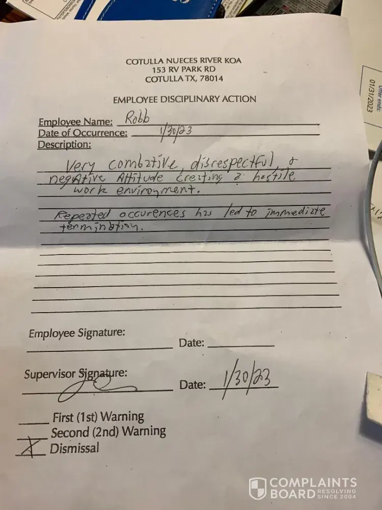 Cotulla KOA, were he handed a piece of paper to Rob, dated January 16, 2023, and told him to sign it.
