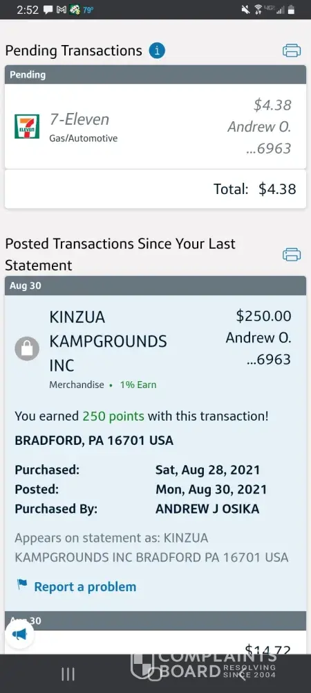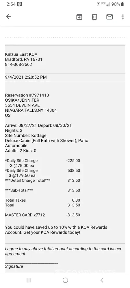 Hello, I stayed at your koa kinzua east campground in Pennsylvania. I stayed from August 27th-30th. While we were there, we upgraded for two nights to a cottage. My husband paid the difference on his credit card of $250.00 We checked out on Monday the 30th. They decided to check us out September 7th. They charged my card $313.50 when they checked us out on the 7th for the upgrade we already paid for. We have called the campground twice for a refund. All we've been told is that they are too busy to do the refund. I will be disputing this with my bank if the doesn't clear up today. I also will be telling my bank they will not refund because they are just too busy. I am not happy at all with these owners and want my $313.50 refunded to my card immediately! I have included pictures of my husband's credit card that was charged. I also included my bank information which shows they double dipped and I was charged more for this upgrade