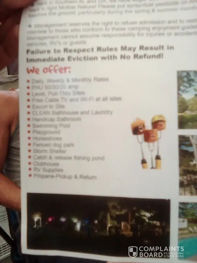 We reserved a campsite at a campground in Ozark Alabama by KOA it advertised on the internet and in their pamphlet that we would have access to a pool a dog park and a fishing pond however when we got here we are not even being placed inside of the KOA campground we were placed on the front lawn by the office in front of the bathroom and we are not allowed to go in the pool and we are not allowed access to the supposed dog park and fishing pond because we're not inside the campground and we're not allowed inside the campground because we're not permanent residents so we are being discriminated against and lied to about the amenities here this is the second KOA campground in the last week that has discriminated against us because we are in a tent between Florida and Alabama.. I feel I should be transferred to another KOA facility where I am allowed to use all amenities that are advertised and offered to other people renting the same sites here and or I want my entire bill reimbursed for my KOA rewards and my stay here this time my name is Karen Roth my phone number is [protected] I am extremely unhappy and will spread the word in every state we go to how awful KOA is because they already got a business huh