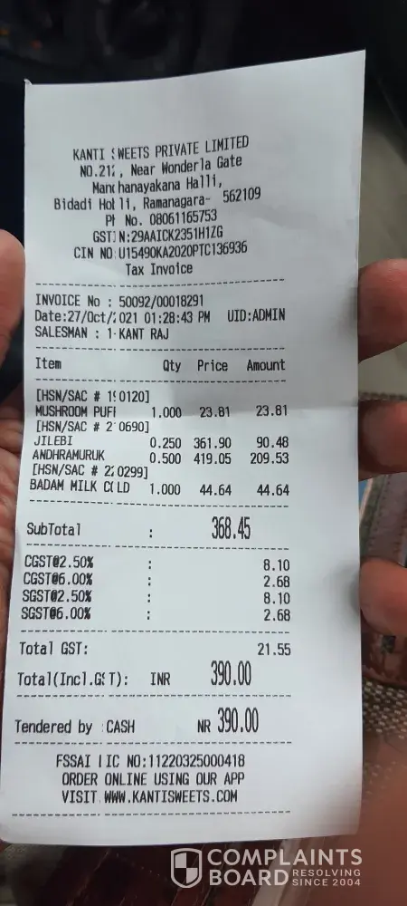 I am a regular customer of kanti sweets TC palya branch and have never encountered such a problem before.