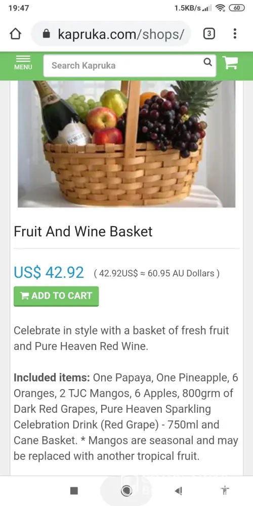 (ay1a2a7628f4) fruit and wine basket us$ 42.92 (42.92us$ ≈ 60.95 au dollars)