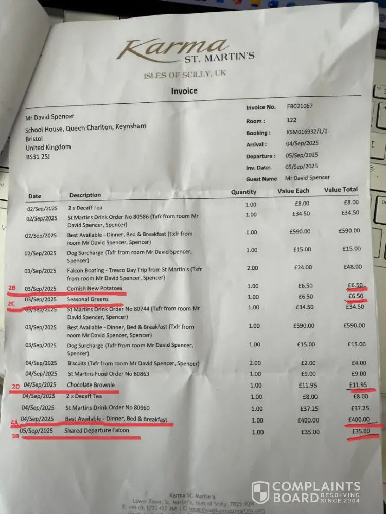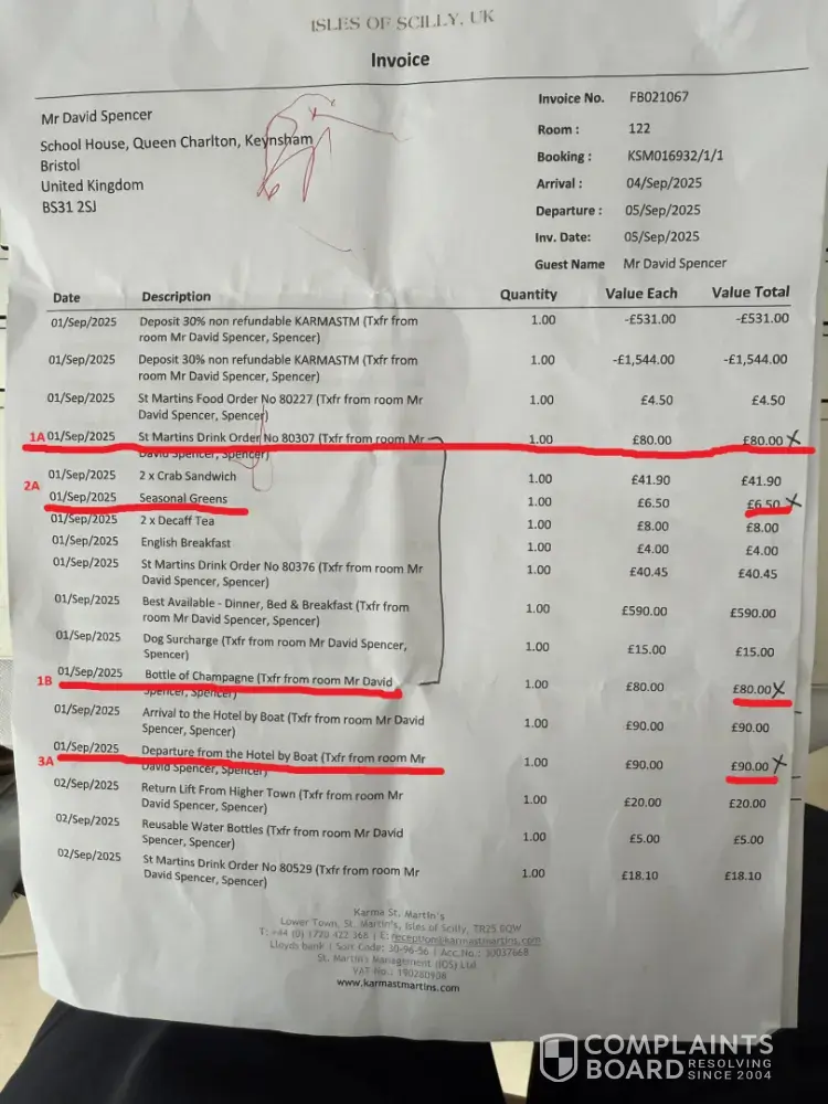 This is the email sent to the manager Scott Fisher at Karma Group hotel Isles of Scilly David and Caroline Spencer My wife and I stayed at the lovely island of St Martins Monday 1st September to Friday 5th September Great holiday A Few difficulties with getting to and from the island due to the weather (nothing to do with the hotel) We extended our leave...