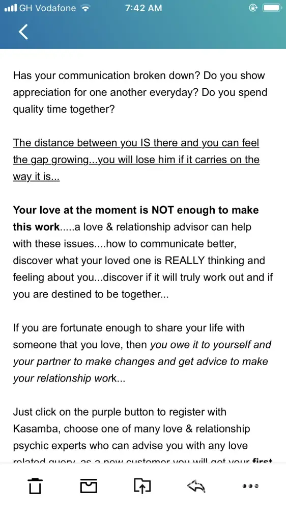 This thing is addictive! Ive never trusted all these but around September 2020, I was shattered after my breakup and the cheating of my ex, so I signed up for kasamba to know if I'll ever be happy. The psychics tell you things that you want to hear( which helped me at that moment) but I was