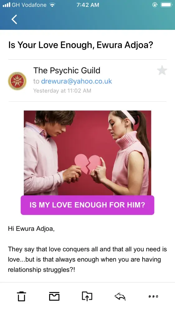Please stop promoting your ad on YouTube! It's so annoying and is only causing me to spread the news about how much your business sucks. I don't believe in psychics, and it's making me so upset to have to constantly listen to a girl say she caught her boyfriend cheating. However now when I see the ad or hear the first second of music I will take my...