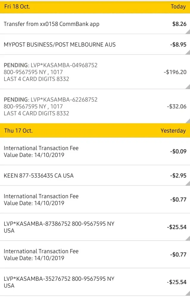 I was charged today 18/10/2019 without even using thus site! One transaction being $192 WTF! Idk how I got charged for something I didn't request I've only ever done 2 readings and those are on my Thursday ones! MONDAY not Today at 2AM in the morning this bad, I'm going to speak to my bank and I will be demanding a refund from kasamba and reporting this company.