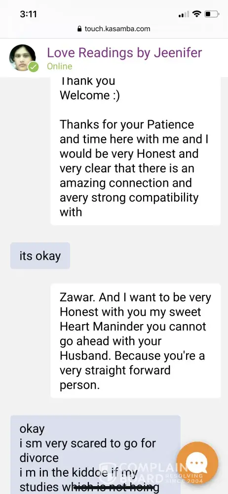 I am very unhappy with Kasamba. Not a single thing has come to fruition that was predicted by any of the number of psychics I spoke to. They all give you the same timelines and say "he will come back" so that you'll keep calling when it doesn't happen. They are all fairy tale predictions. They all said different things that felt like they were guessing. Asked too many questions. Very unhappy with the unprofessional psychics. I trusted them and gave them the benefit of the doubt but all of the timelines and predictions gone by and nothing has been accurate.