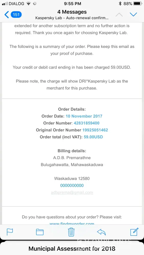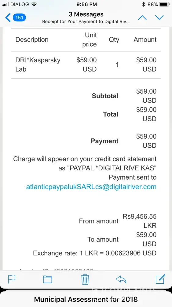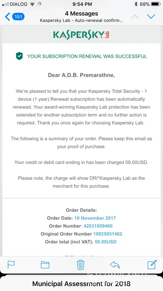I installed Kaspersky Internet Security package in my lap top on 13 June 2017. It was working well upto date without any problem. Then, I received two emails on 10 November 2017 from PayPal confirmation of receipt of USD 59 and from Kasperskey confirming updated software.